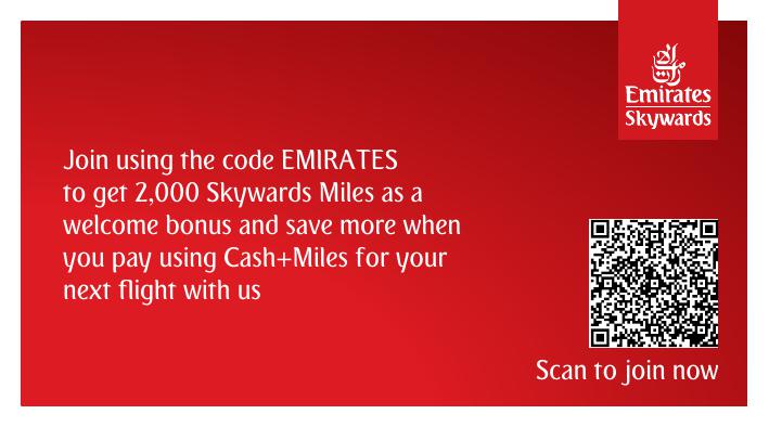 Meld je aan met de code EMIRATES en ontvang 2.000 welkomst-Skywards miles; bespaar meer bij je volgende vlucht door te betalen met Cash+Miles. Scan en word nu lid.