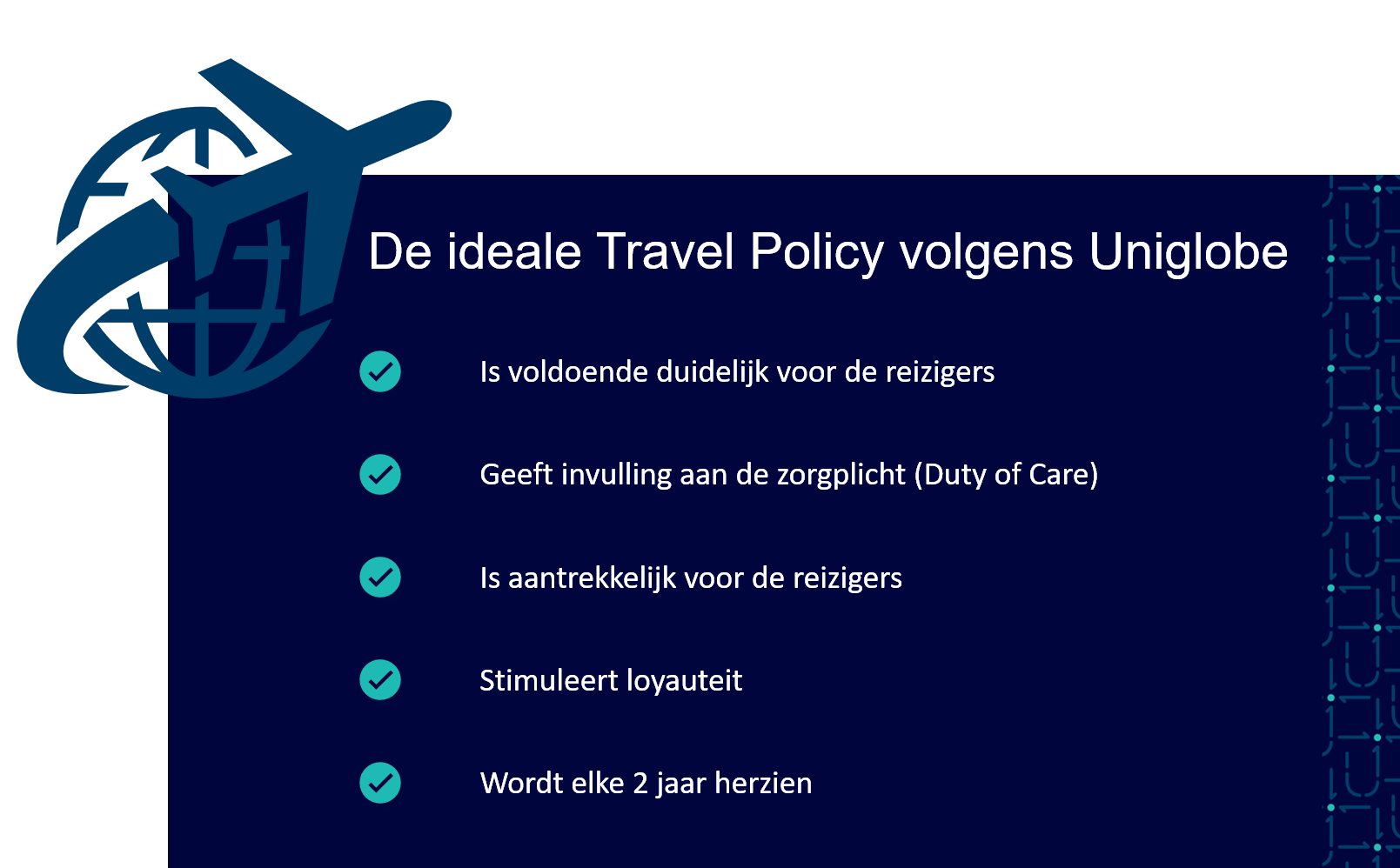 Draag in de Policy geen beperkingen op aan de reizen, maar creëer mogelijkheden voor de reizigers en maak het reisbeleid aantrekkelijk, vooruitstrevend en comfortabel.